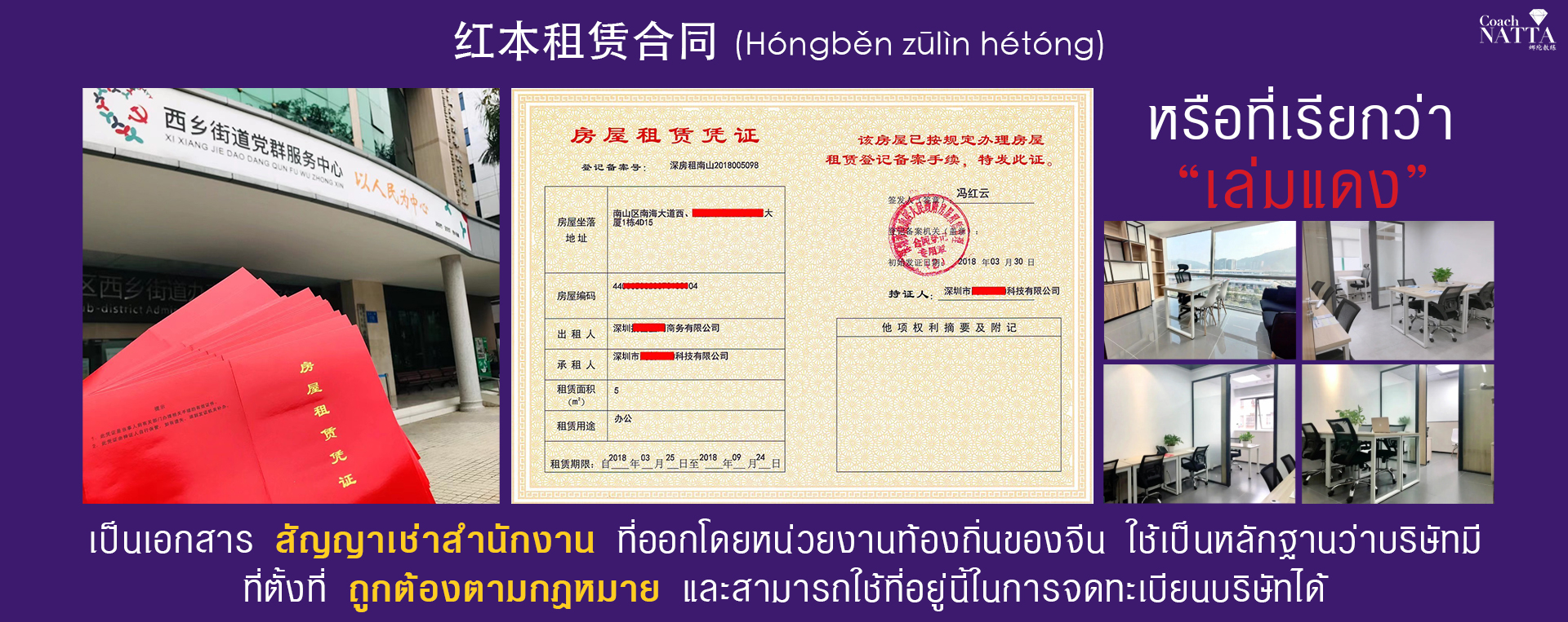 红本租赁合同 (Hóngběn zūlìn hétóng) หรือที่เรียกว่า "เล่มแดง" เป็นเอกสารสัญญาเช่าสำนักงานที่ออกโดยหน่วยงานท้องถิ่นของจีน ใช้เป็นหลักฐานว่าบริษัทมีที่ตั้งที่ถูกต้องตามกฎหมาย และสามารถใช้ที่อยู่นี้ในการจดทะเบียนบริษัทได้
