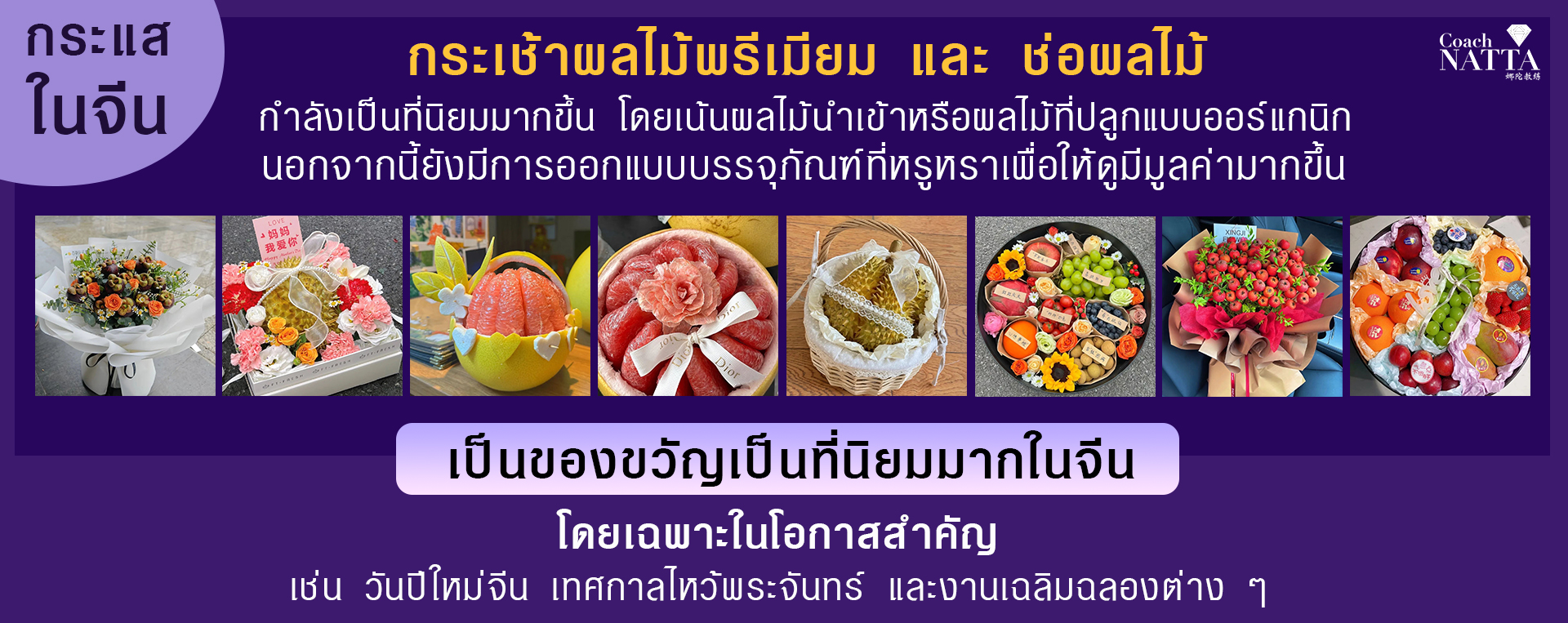กระแสในจีน กระเช้าผลไม้พรีเมียม และ ช่อผลไม้ กำลังเป็นที่นิยมมากขึ้น โดยเน้นผลไม้นำเข้าหรือผลไม้ที่ปลูกแบบออร์แกนิก นอกจากนี้ยังมีการออกแบบบรรจุภัณฑ์ที่หรูหราเพื่อให้ดูมีมูลค่ามากขึ้น